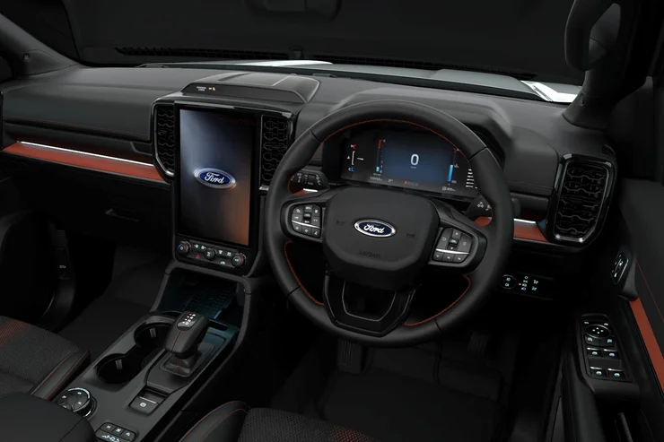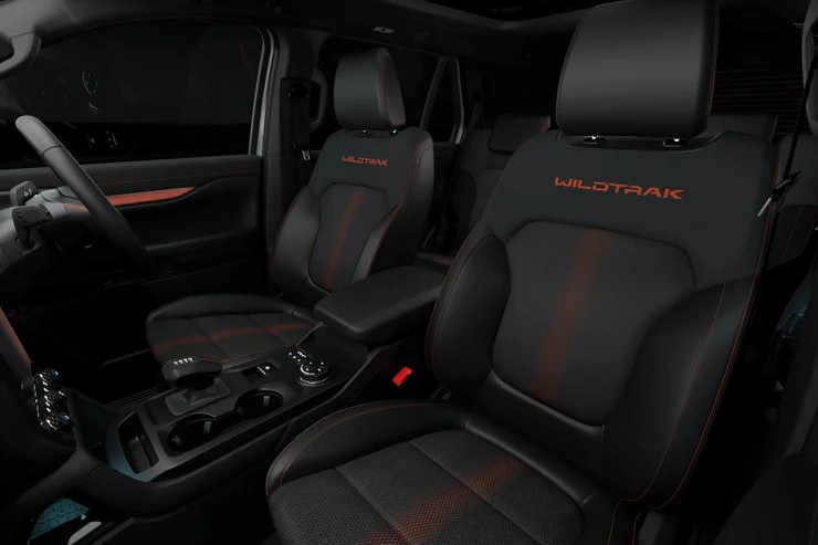 Салон Ford Everest оздобили шкірою із помаранчевими вставками. Комплектація розширена і включає матричні фари, панорамний дах, камери кругового огляду, електроприводт крісла водія та складання сидінь третього ряду.